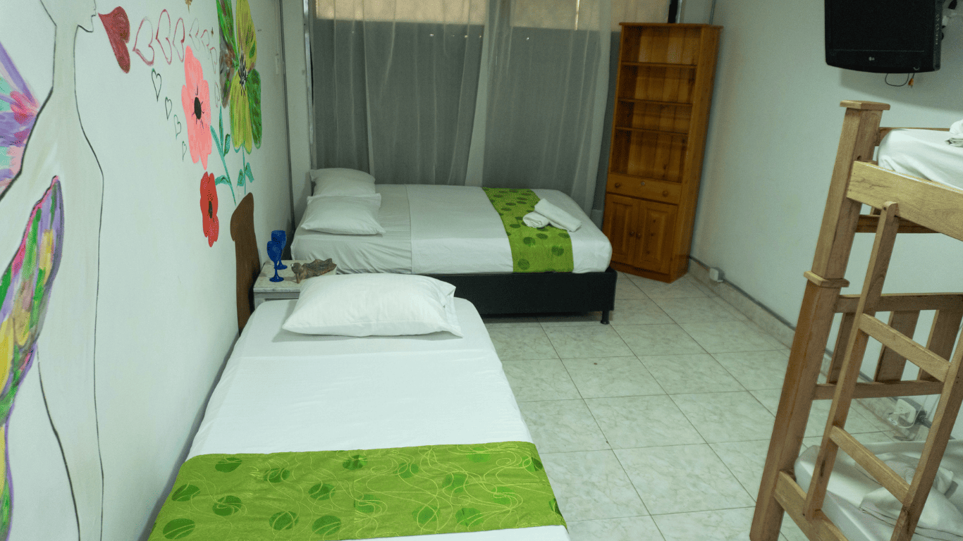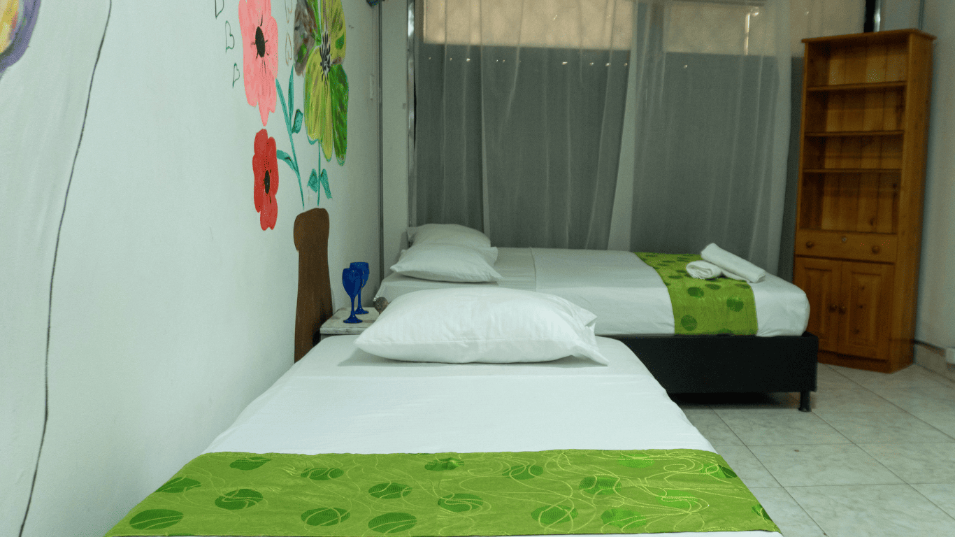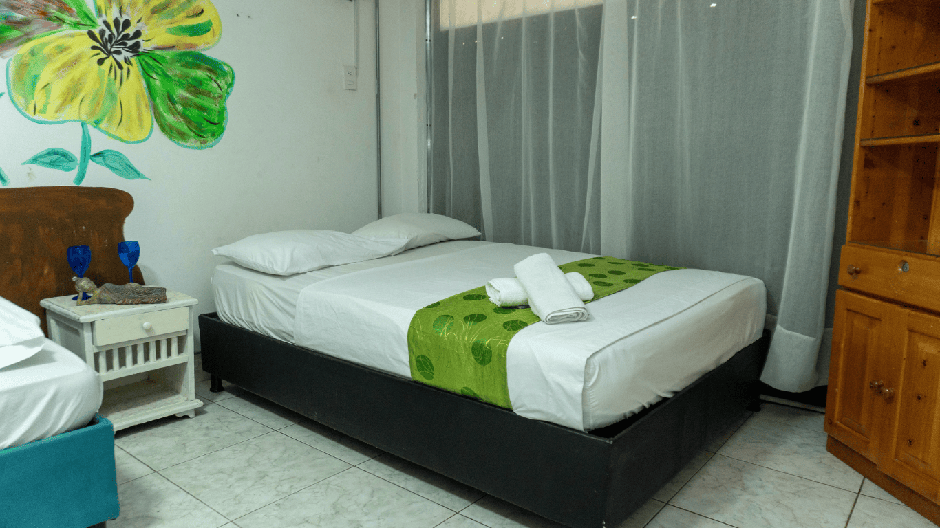 Cama doble y cama sencilla en el segundo piso. Excelente ventilación y aire acondicionado. Baño compartido.