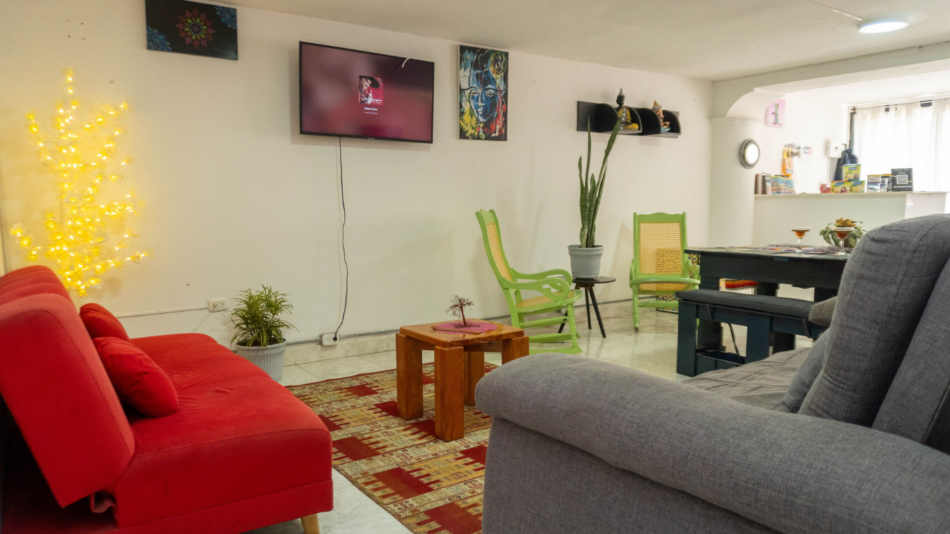 Habitación en el primer piso con una cama doble y una sencilla. Cuenta con aire acondicionado y TV. Baño compartido justo al lado.